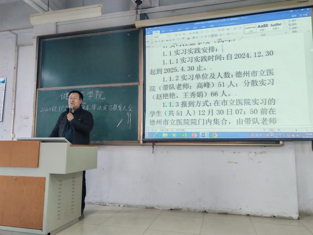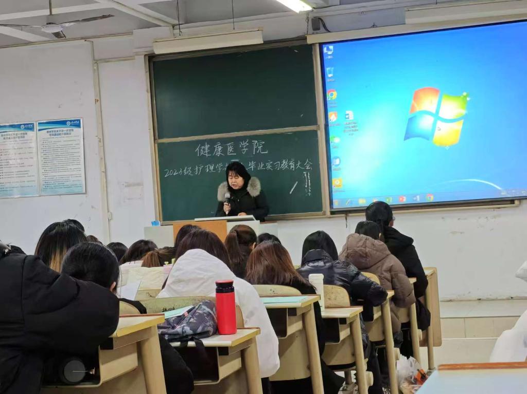 2024年12月26日16:10,健康医学院于体育楼0315教室举行了2023级护理学专升本毕业实习教育大会。学院主要负责人、护理学专业实习实践负责老师及2023级护理学专升本全体学生参加了本次活动。